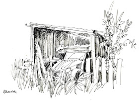 Euan Sarginson, my late friend and co-author of New Zealand Odyssey, parked this old Citröen 2CV in a distressed shed on his property at the head of Lyttelton Harbour. It was just visible through the long grass when I sketched it many years ago.