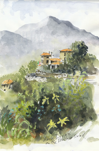 My feet were dangling over a steep fall as I sat on the side of the narrow road and sketched this view of houses looking out over Barga with Monte Pania in the background.