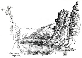 The Australian landscape is a challenge for any artist, especially in black and white with no references such as buildings to give scale. This ordinary looking scene is extraordinary because in outback Australia water is a rare sight. As I drew this my photographer companion was about 30-40 metres up those rock bluffs on the right, carrying camera and tripod to get 'the shot'.